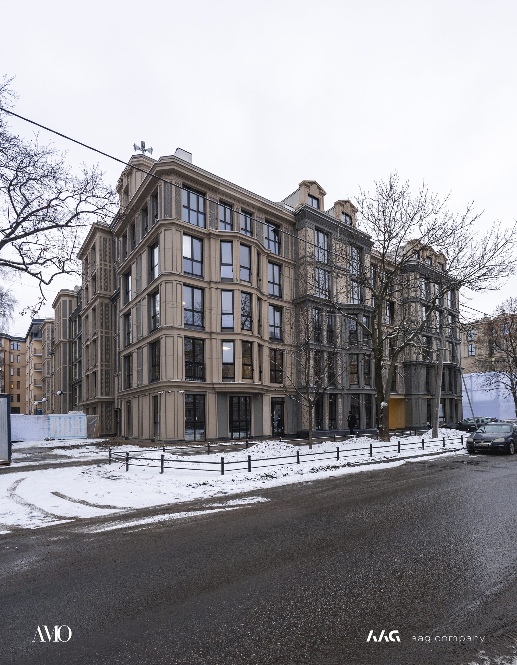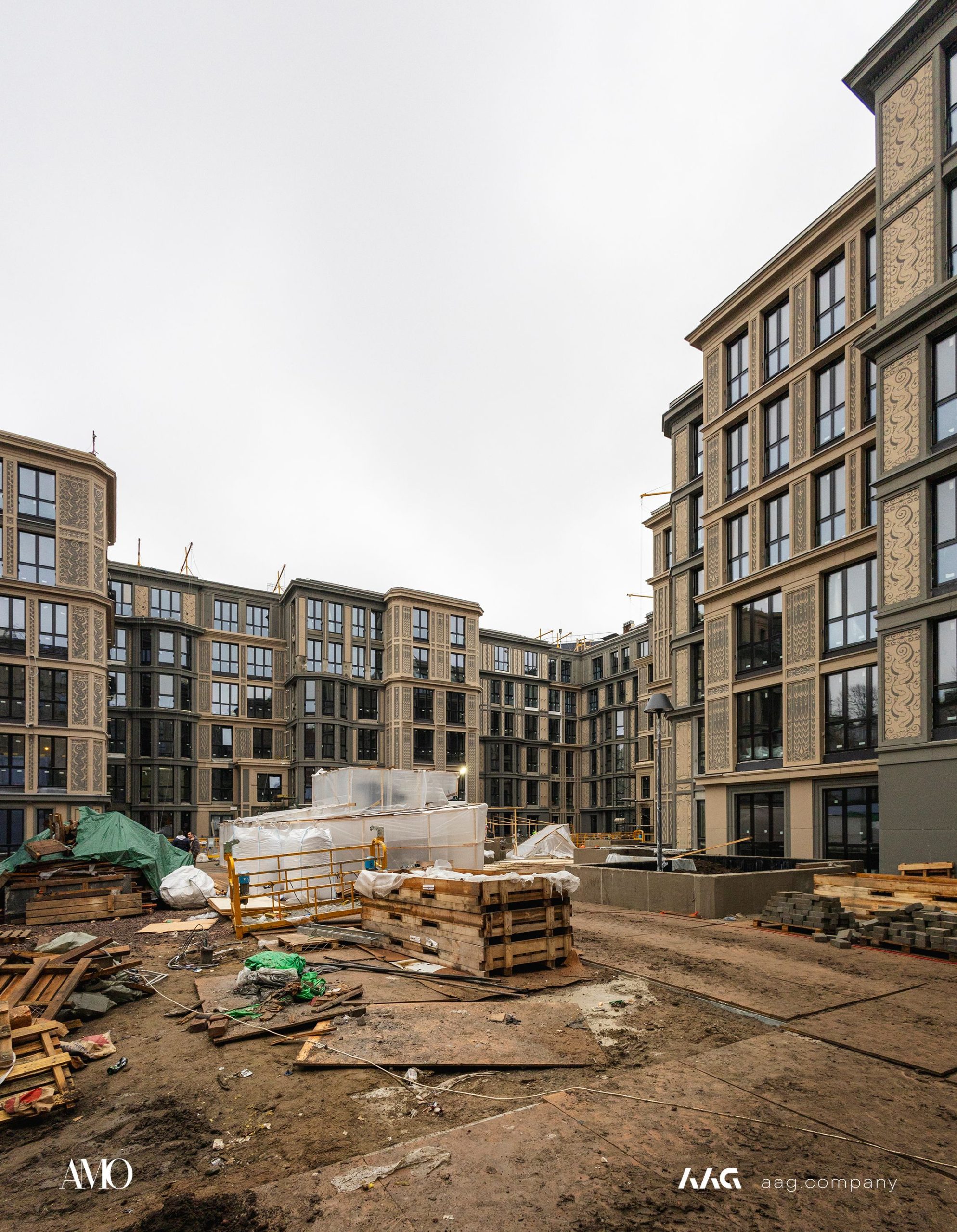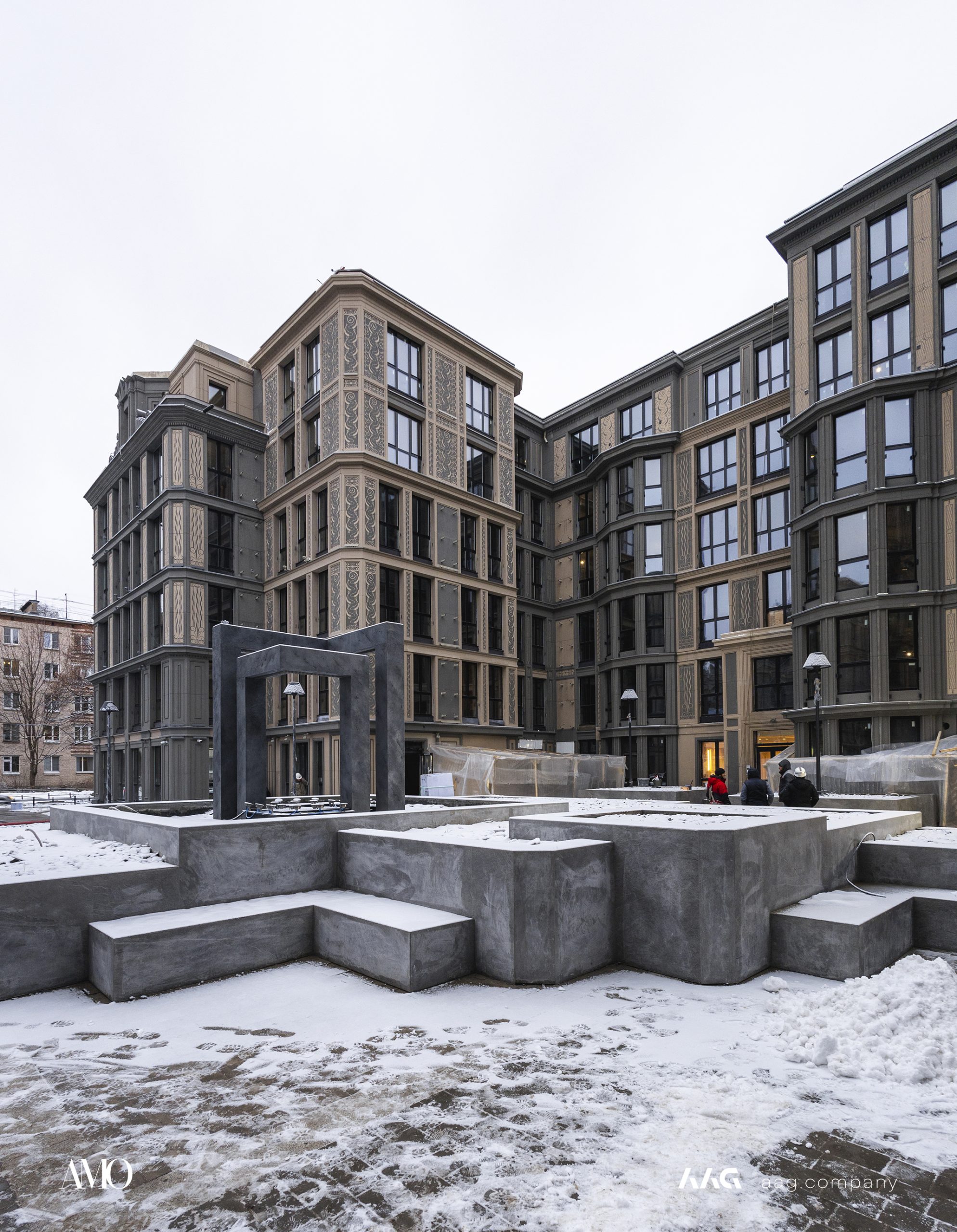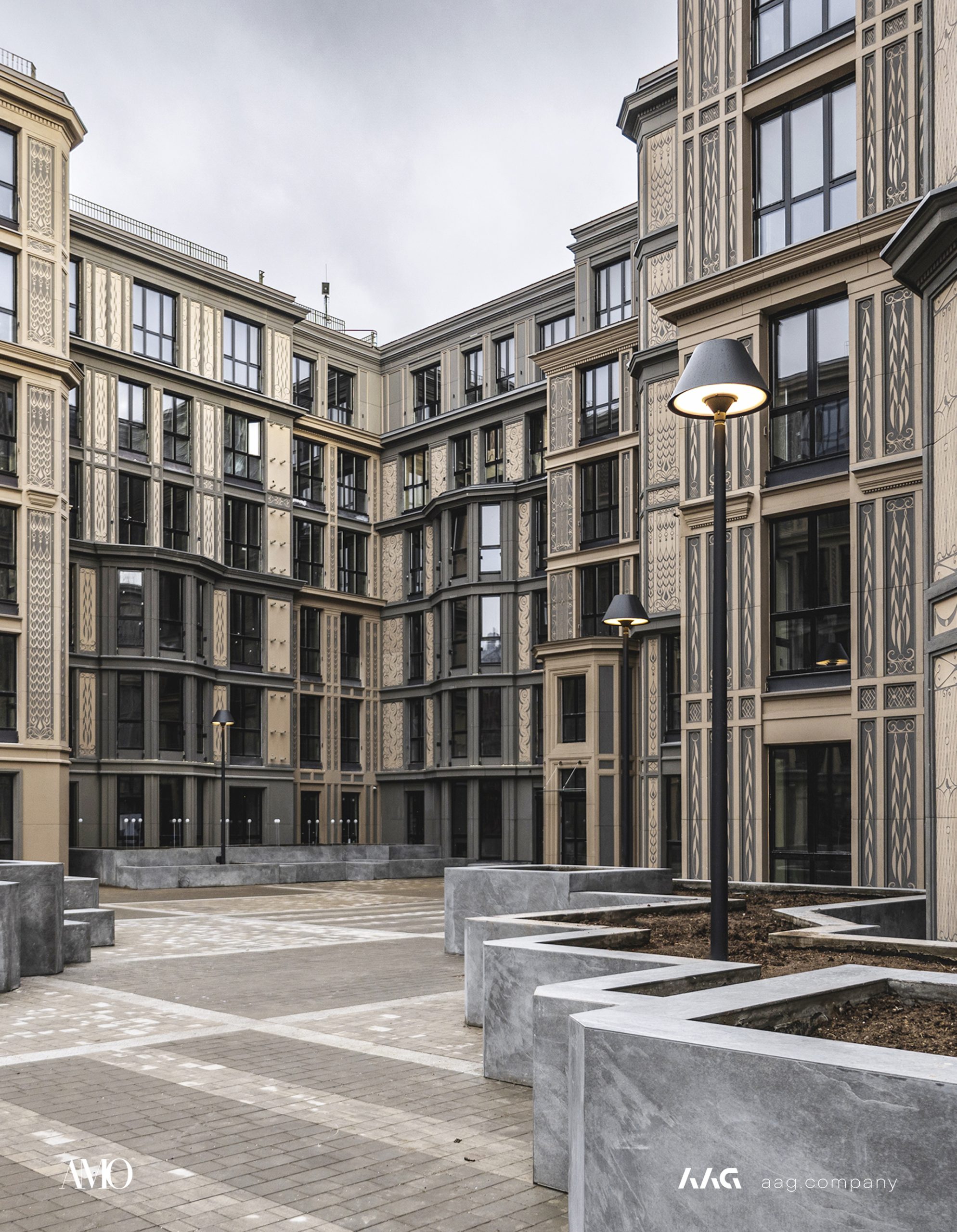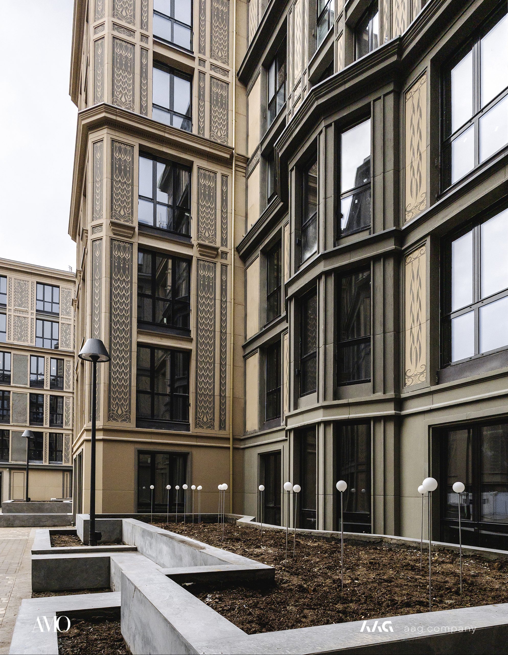 Сам «AMO» — ЖК из трех секций, расположенных в форме буквы П, что характерно для ступенчатой старинной застройки центральных районов Петербурга.