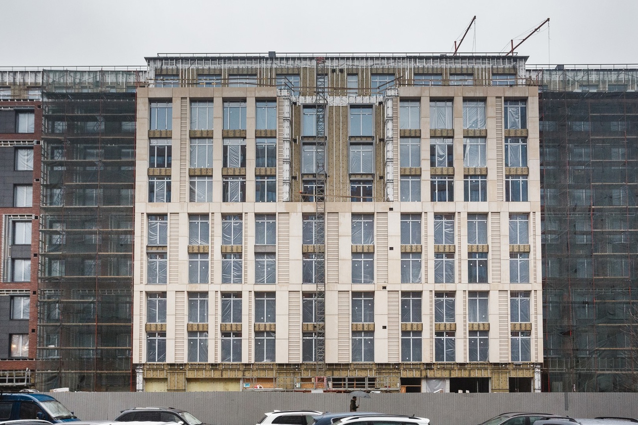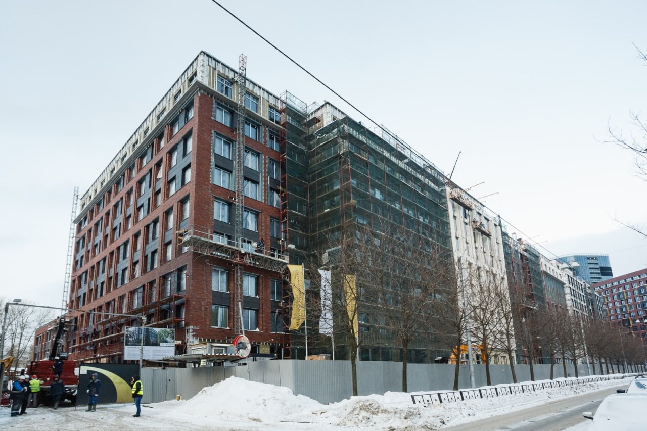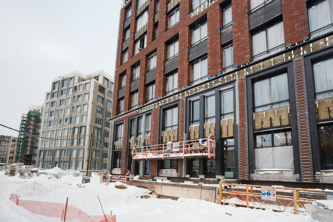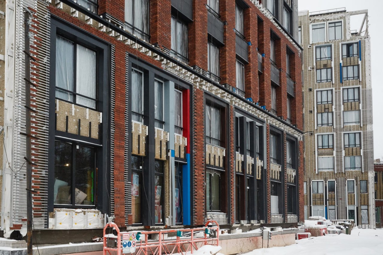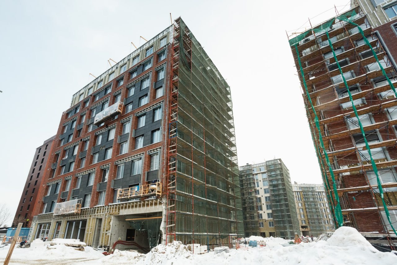Дома в 9 этажей облицованы разнофактурным гранитом и клинкерным кирпичом приятных оттенков, но образуют единую гармоничную композицию. Входные группы и интерьеры общественных пространств также продолжают общую концепцию дизайна фасадов.