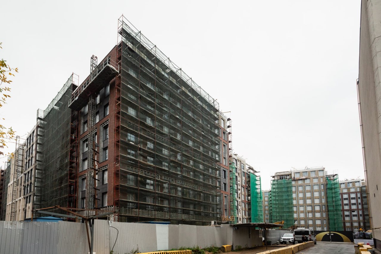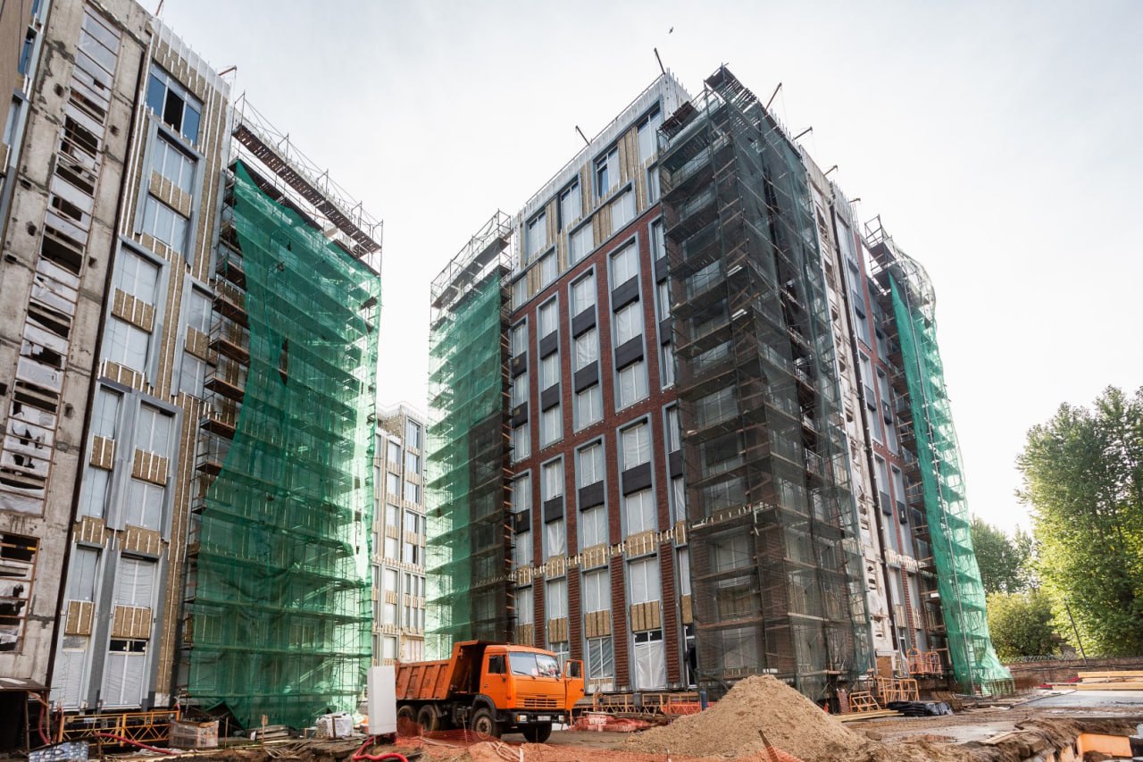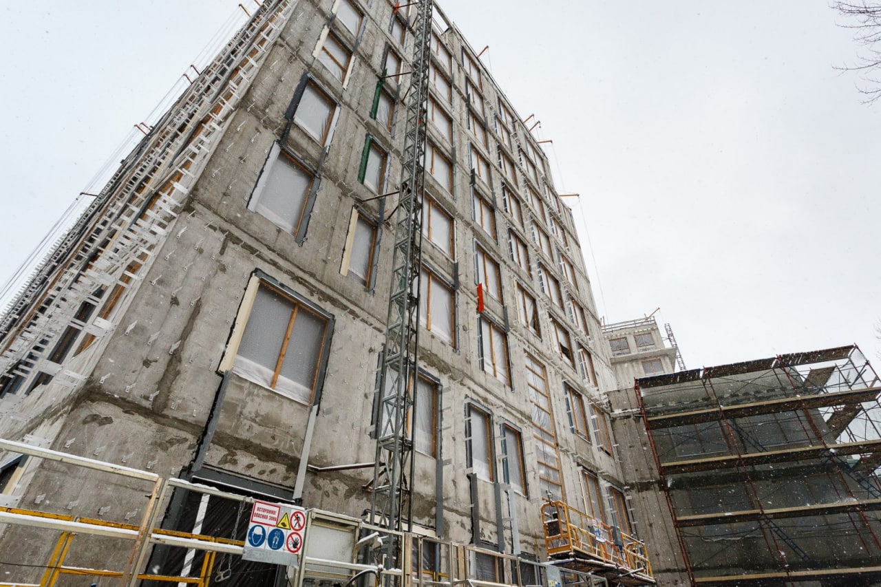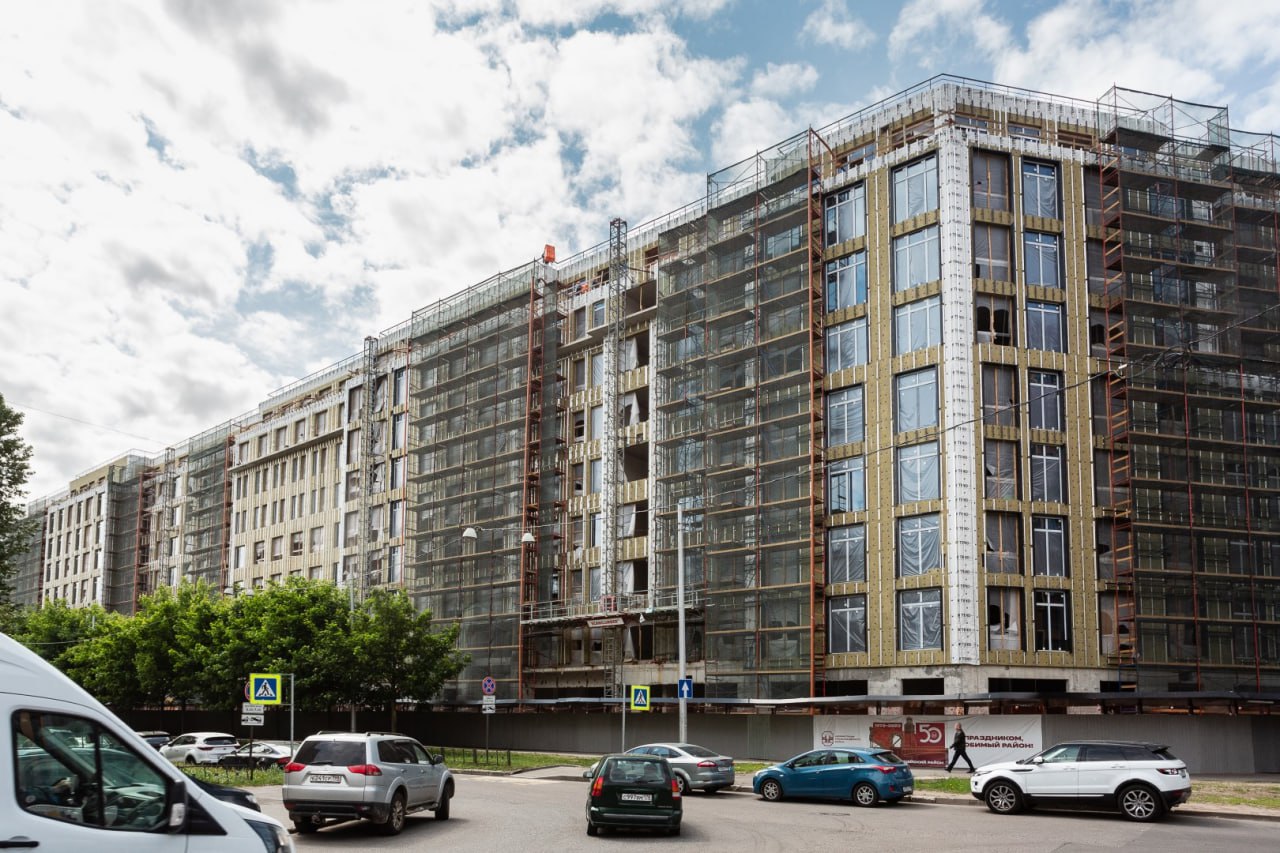 Дома в 9 этажей облицованы разнофактурным гранитом и клинкерным кирпичом приятных оттенков, но образуют единую гармоничную композицию. Входные группы и интерьеры общественных пространств также продолжают общую концепцию дизайна фасадов.
