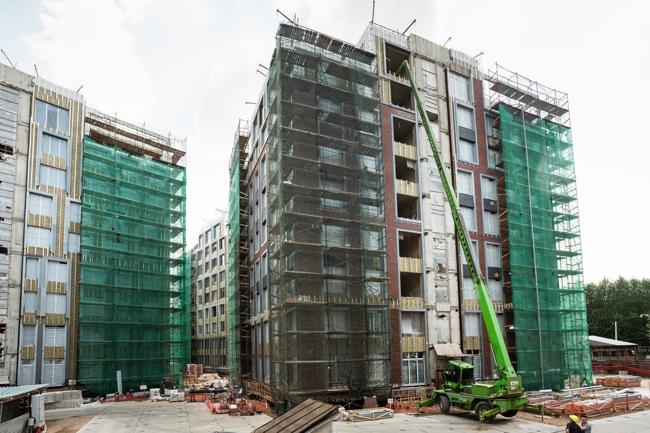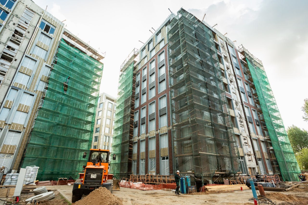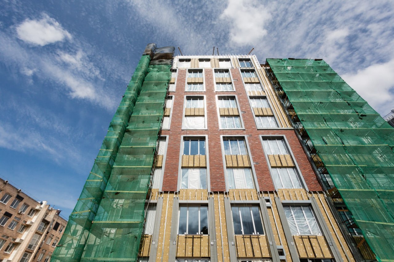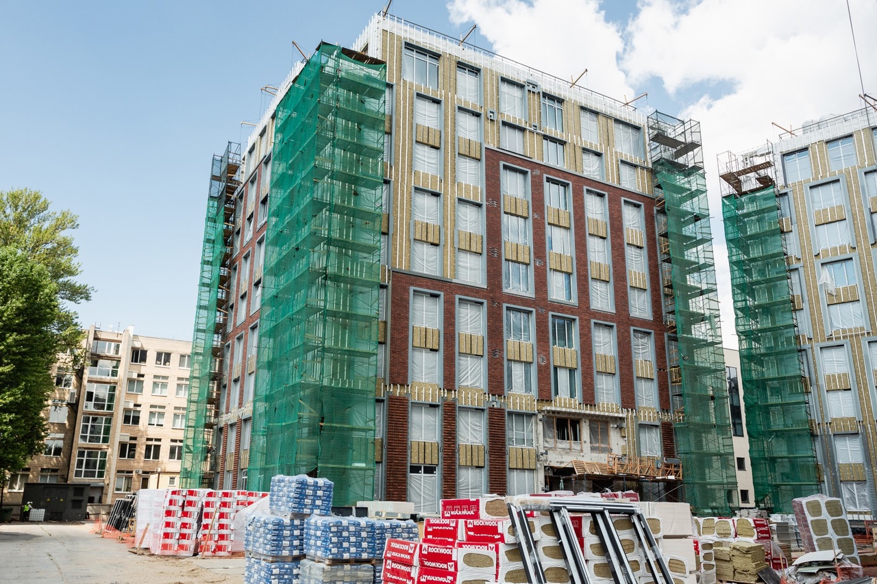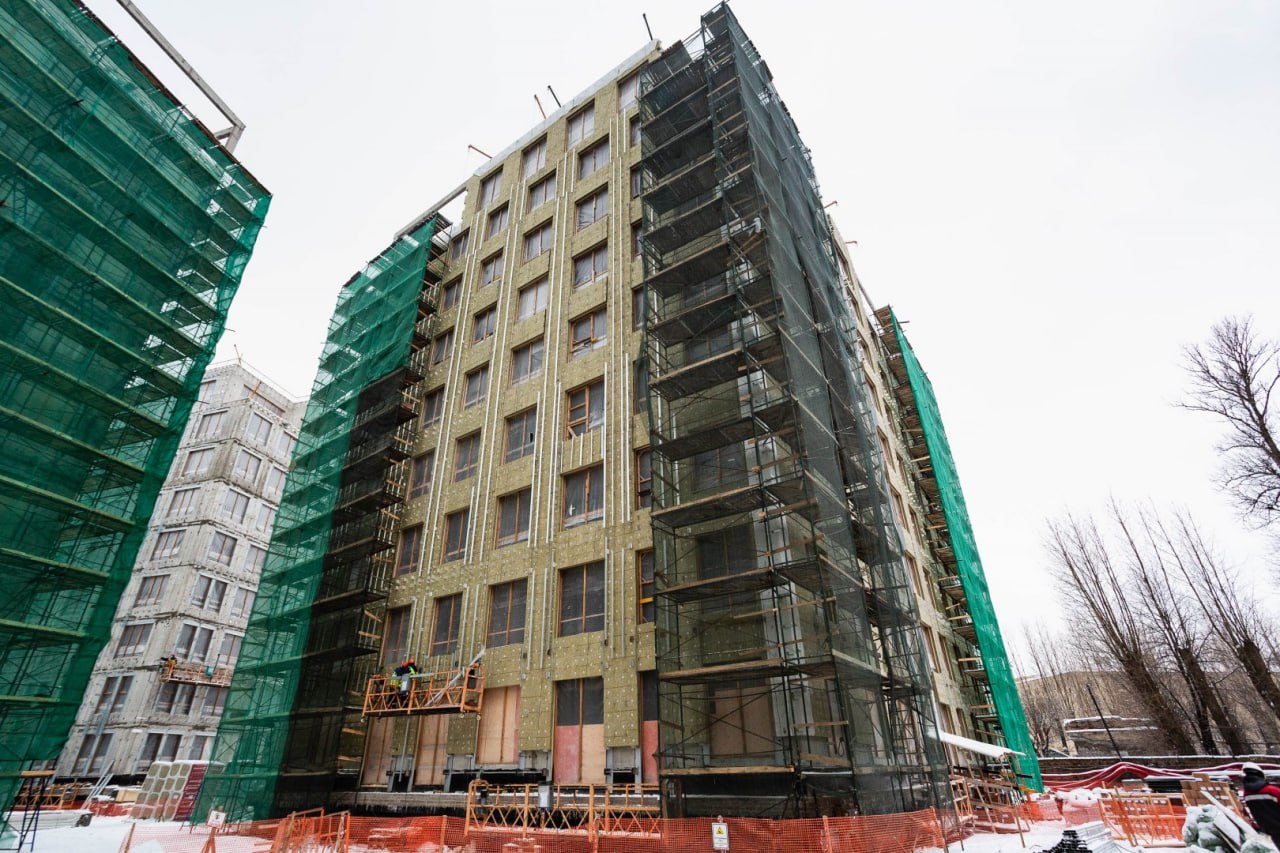 Дома в 9 этажей облицованы разнофактурным гранитом и клинкерным кирпичом приятных оттенков, но образуют единую гармоничную композицию. Входные группы и интерьеры общественных пространств также продолжают общую концепцию дизайна фасадов.