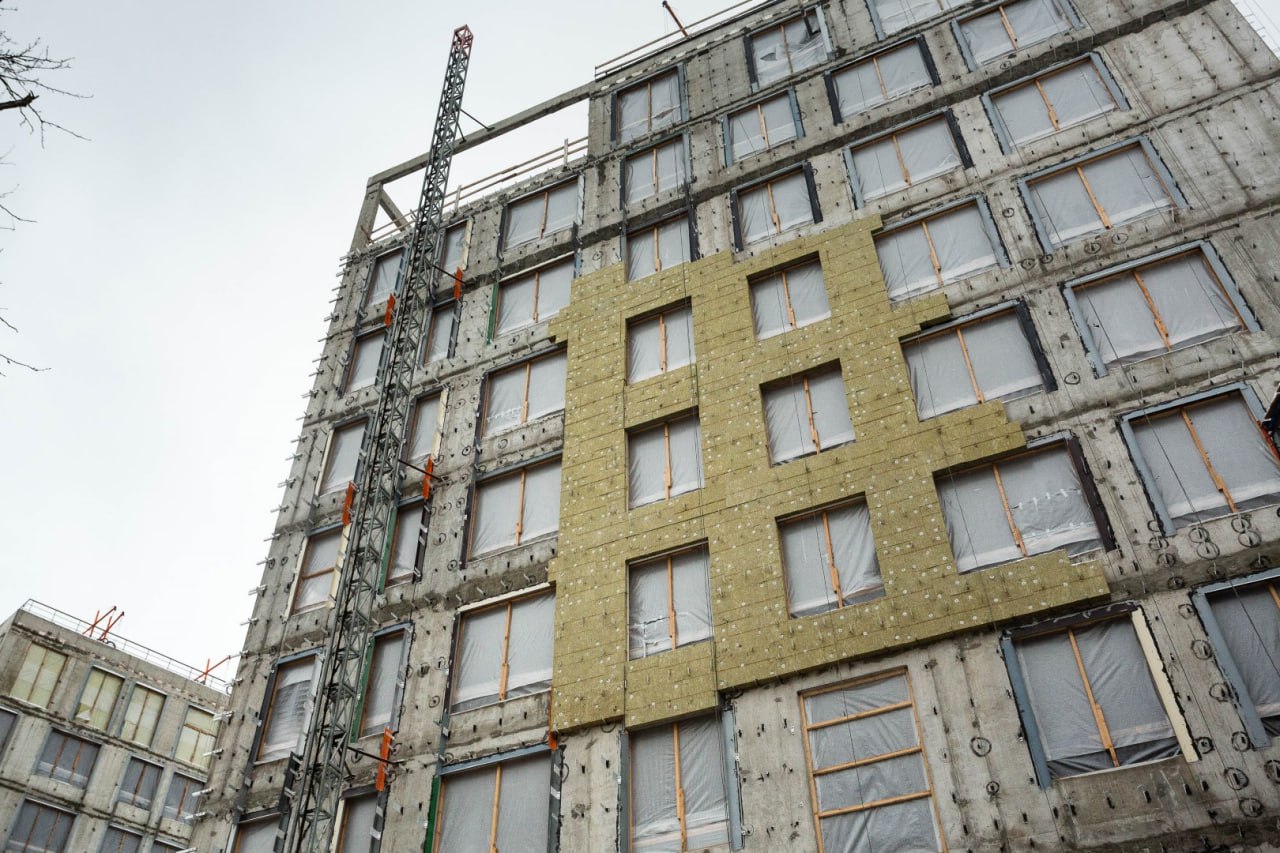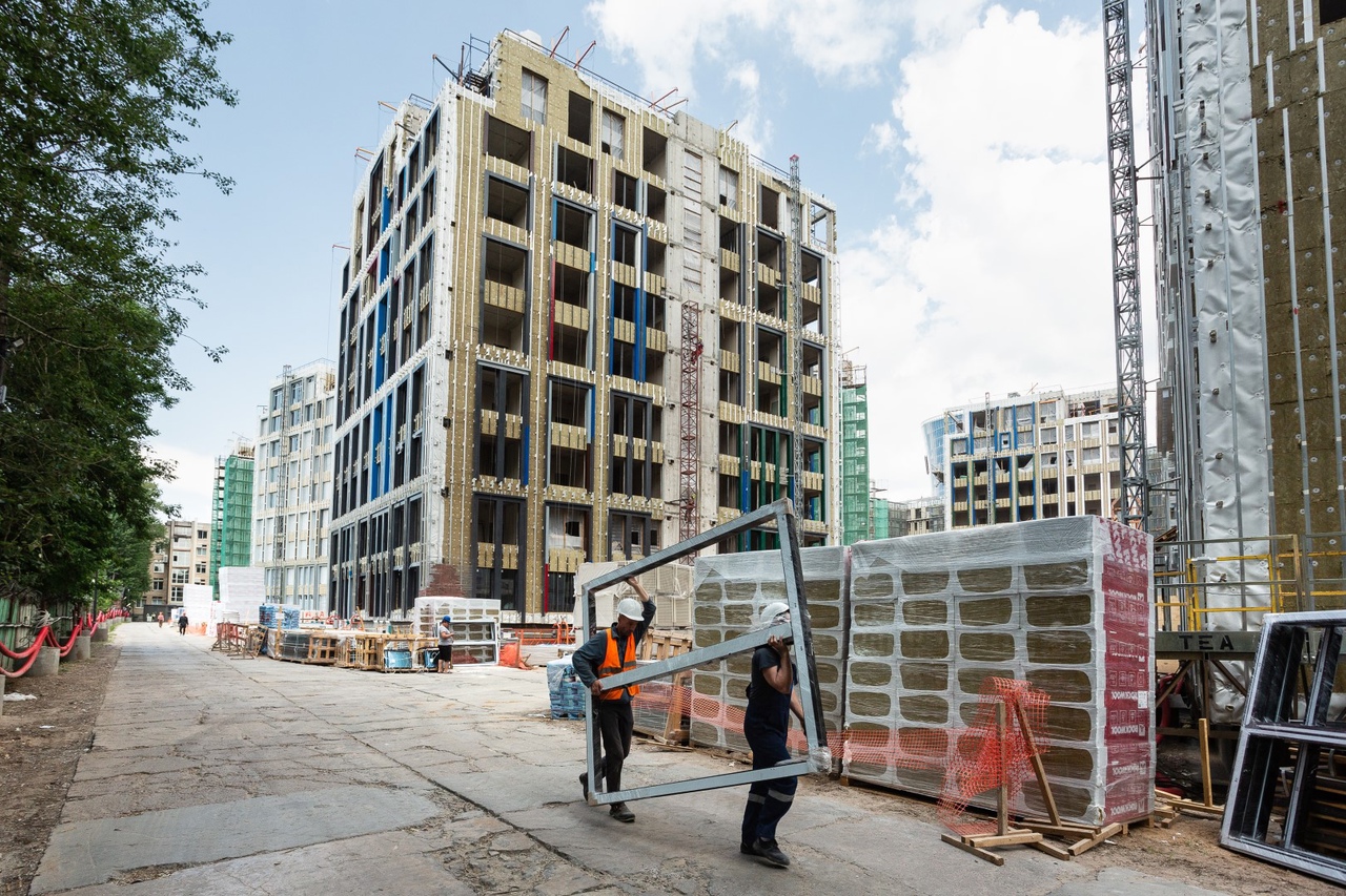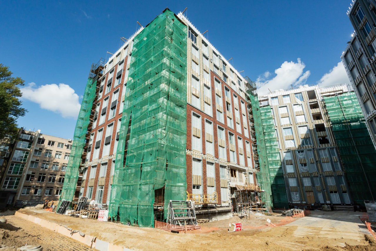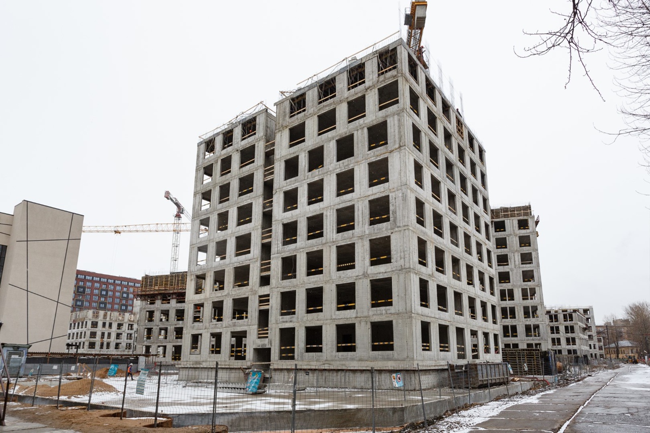 Дома в 9 этажей облицованы разнофактурным гранитом и клинкерным кирпичом приятных оттенков, но образуют единую гармоничную композицию. Входные группы и интерьеры общественных пространств также продолжают общую концепцию дизайна фасадов.