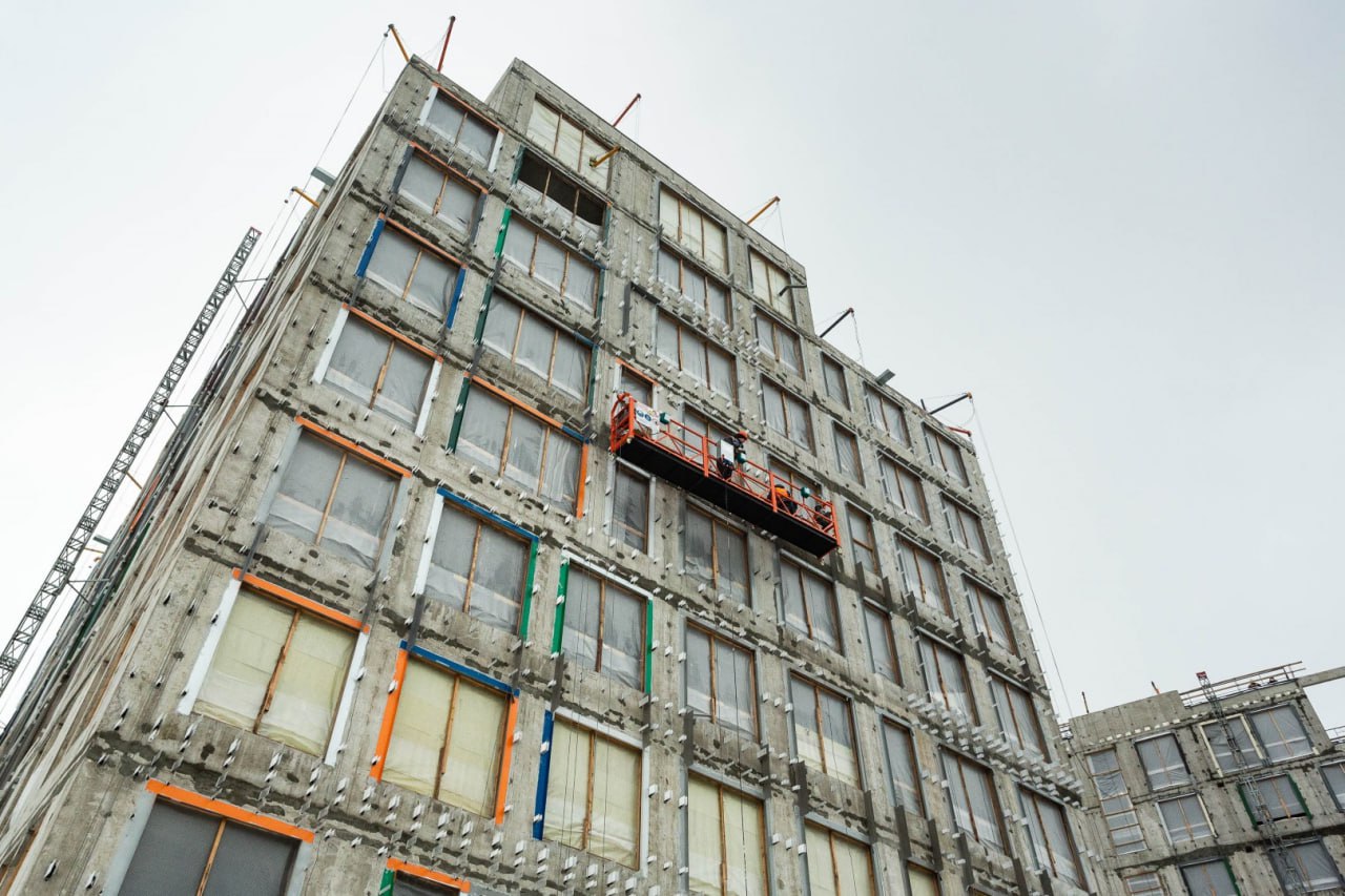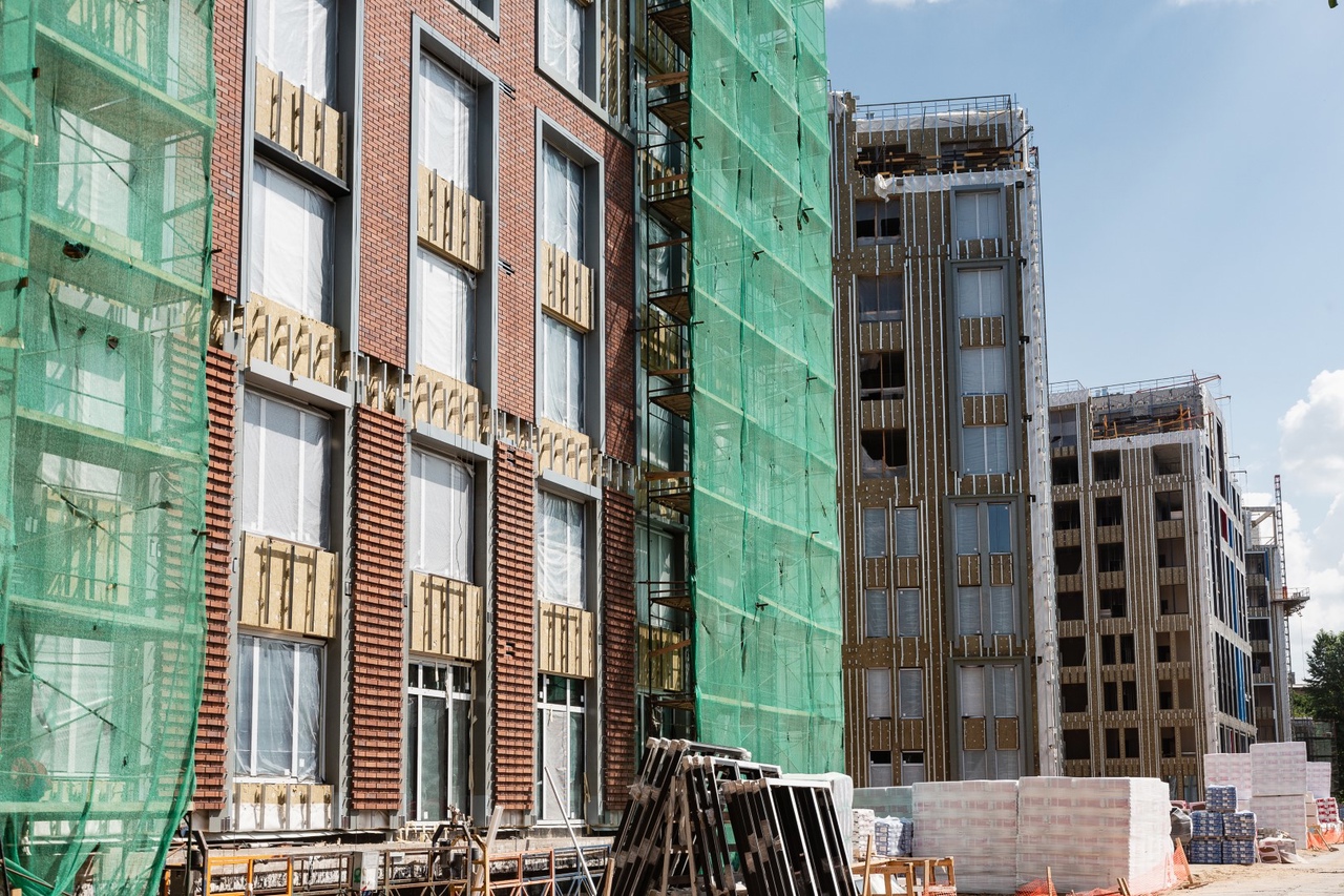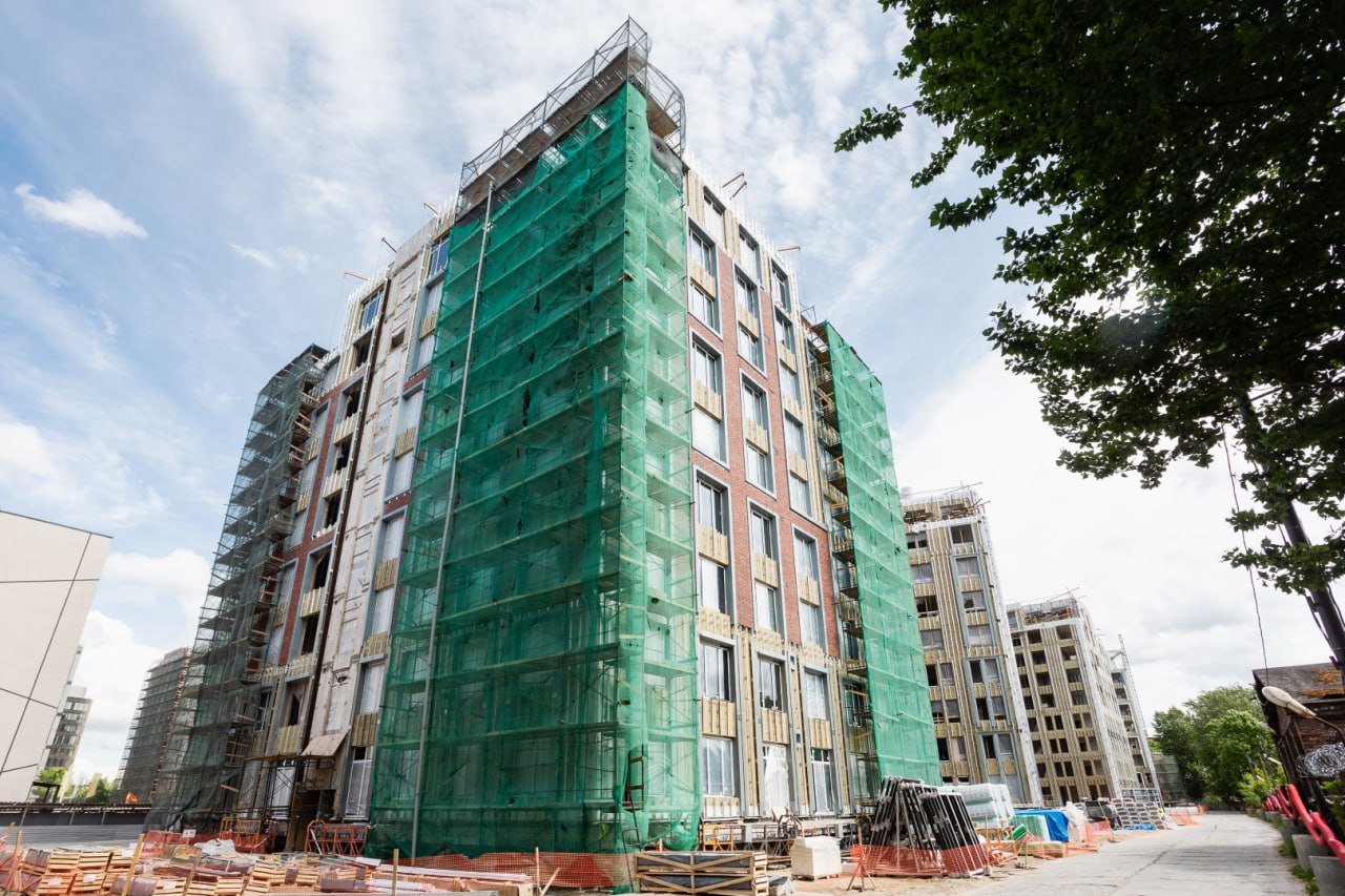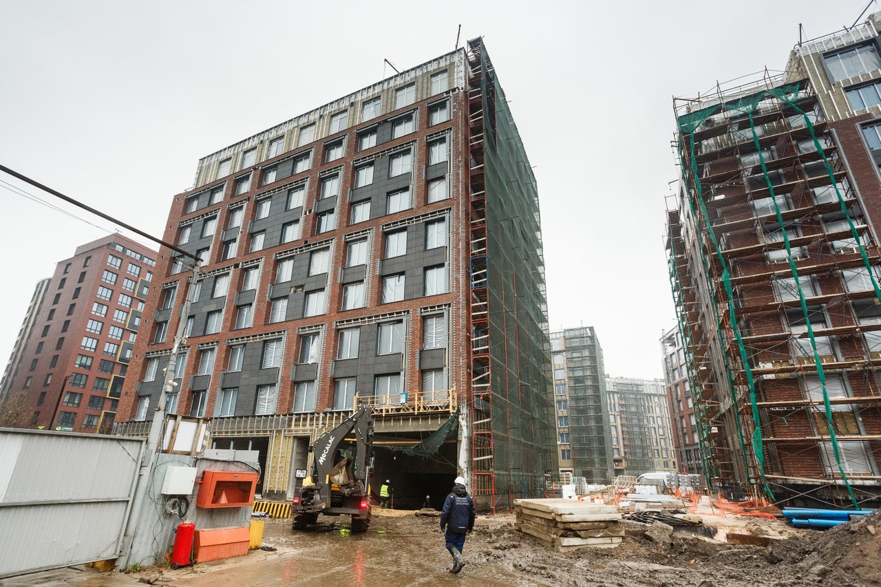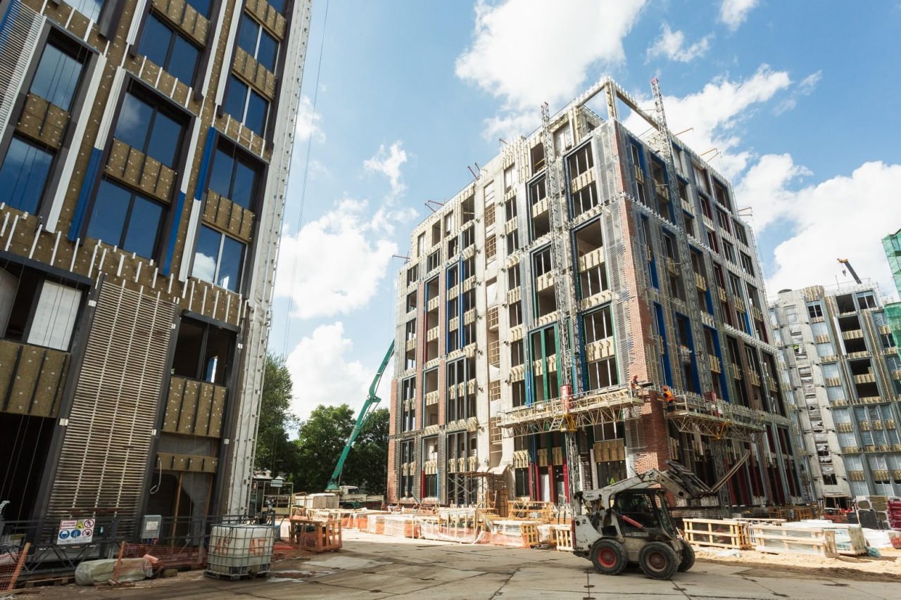 Дома в 9 этажей облицованы разнофактурным гранитом и клинкерным кирпичом приятных оттенков, но образуют единую гармоничную композицию. Входные группы и интерьеры общественных пространств также продолжают общую концепцию дизайна фасадов.