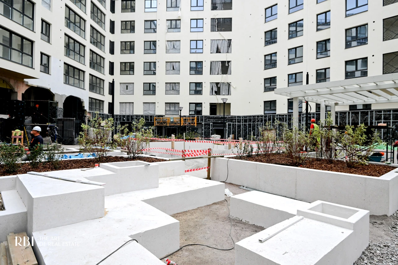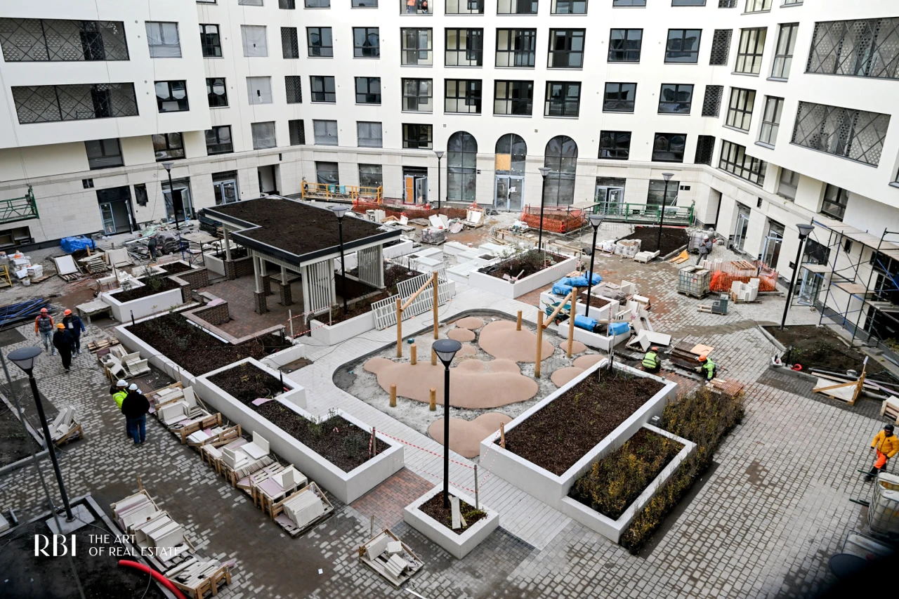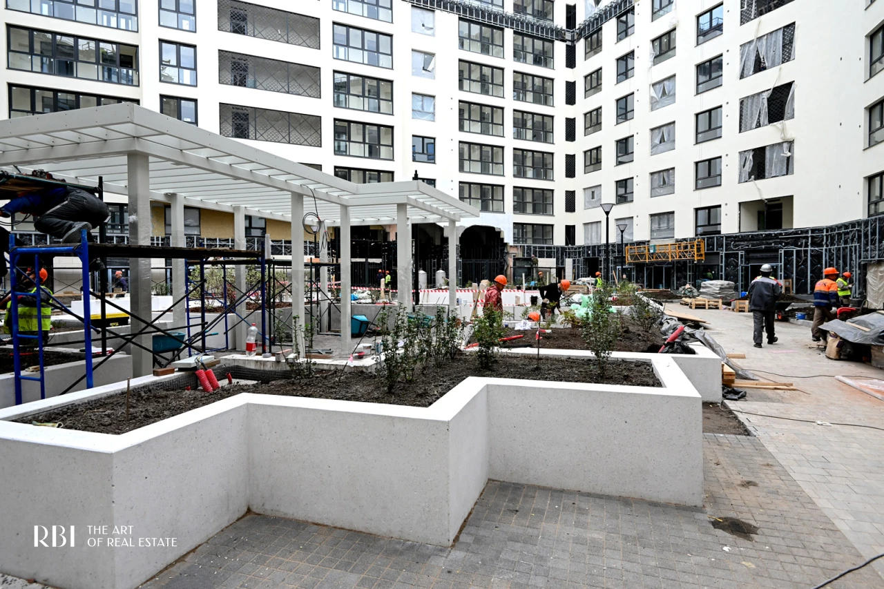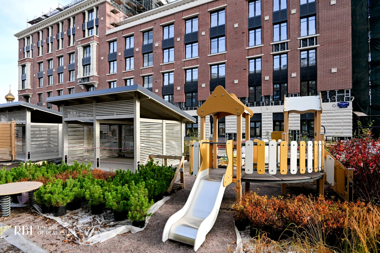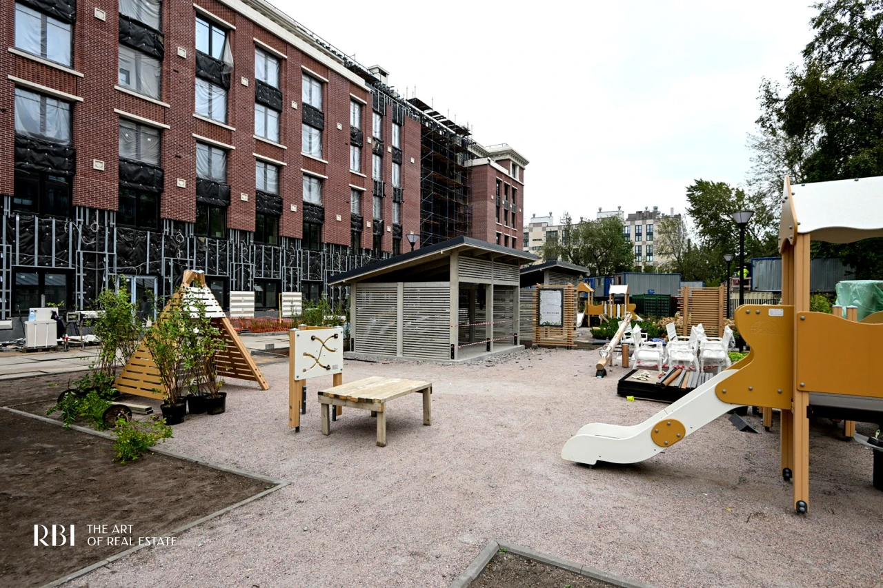 Большое значение RBI придает благоустройству придомовой территории. Внутренний двор похож на зеленый сквер с детской площадкой из натуральных материалов, амфитеатром, деревянными шезлонгами, уличными обогревателями и пространством под навесом.