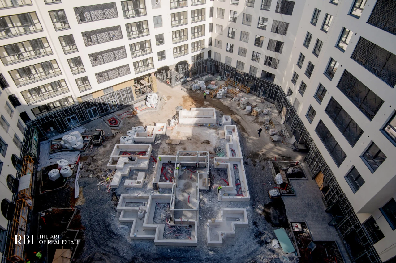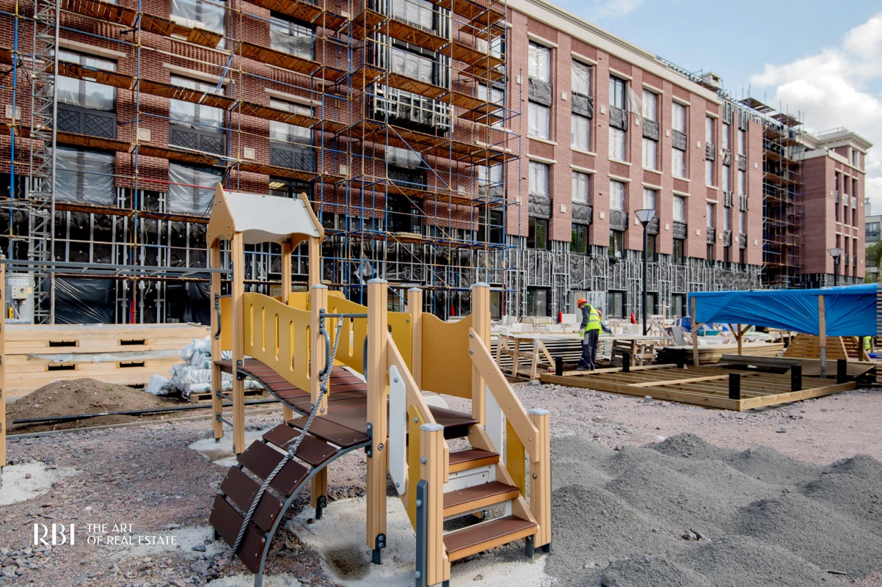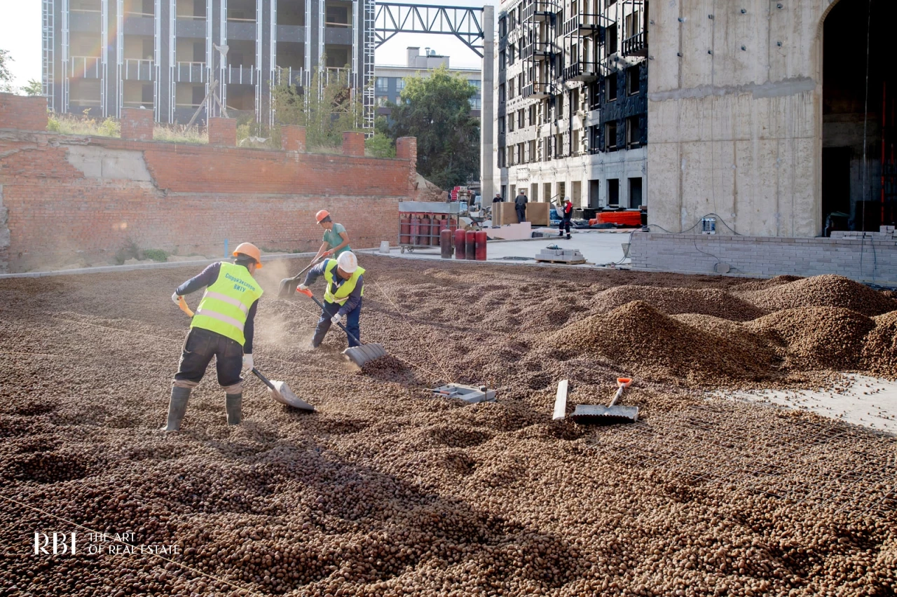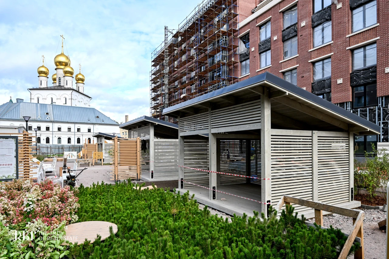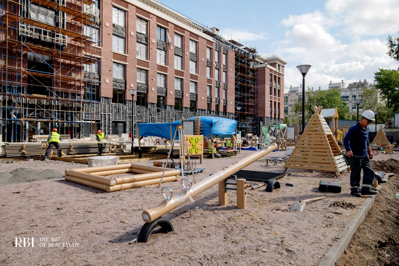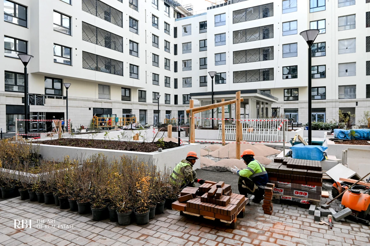 Большое значение RBI придает благоустройству придомовой территории. Внутренний двор похож на зеленый сквер с детской площадкой из натуральных материалов, амфитеатром, деревянными шезлонгами, уличными обогревателями и пространством под навесом.