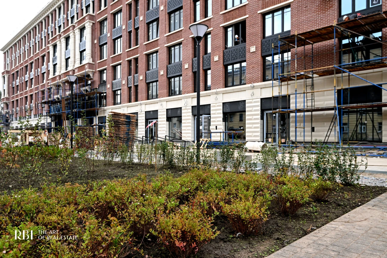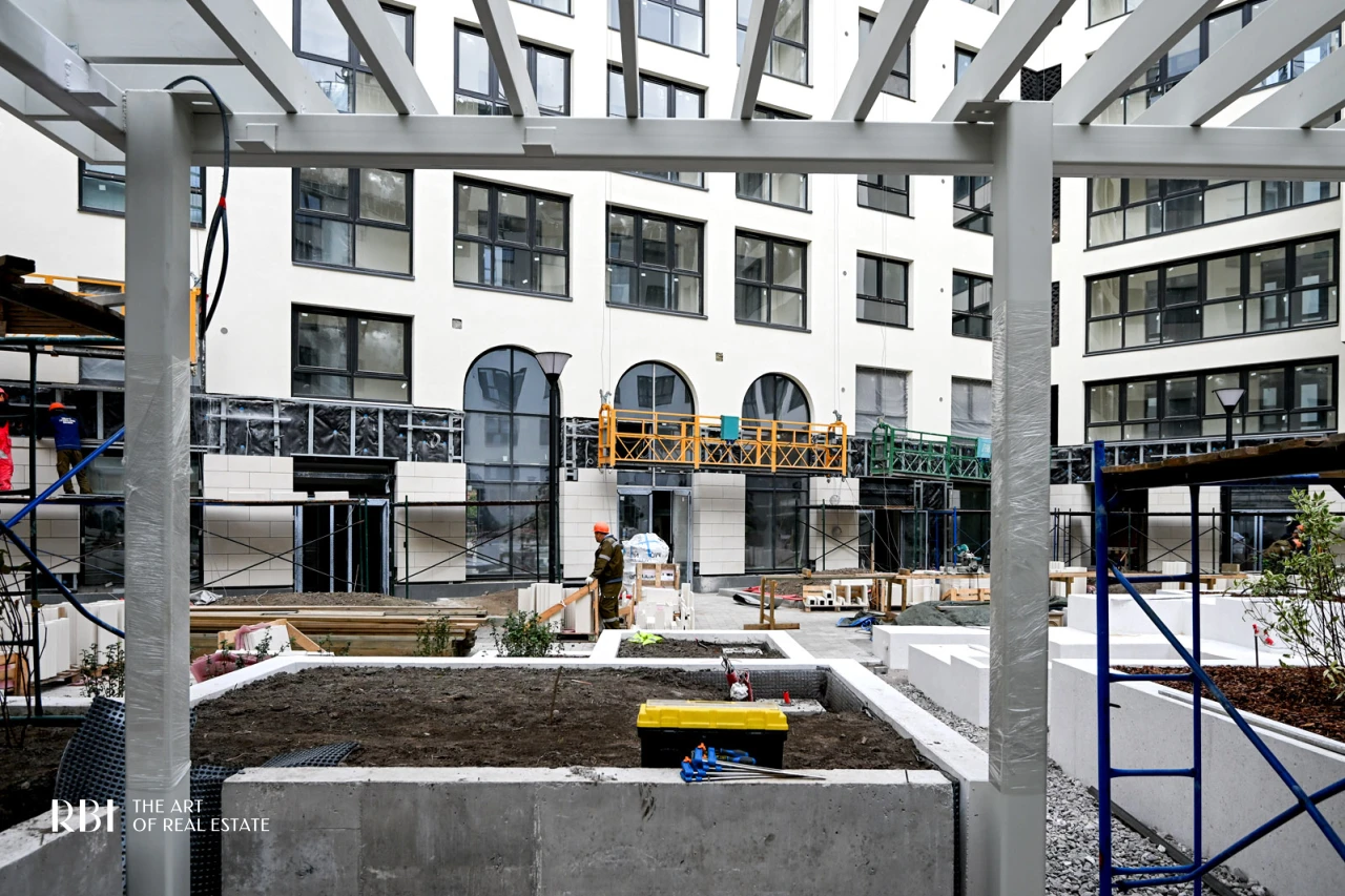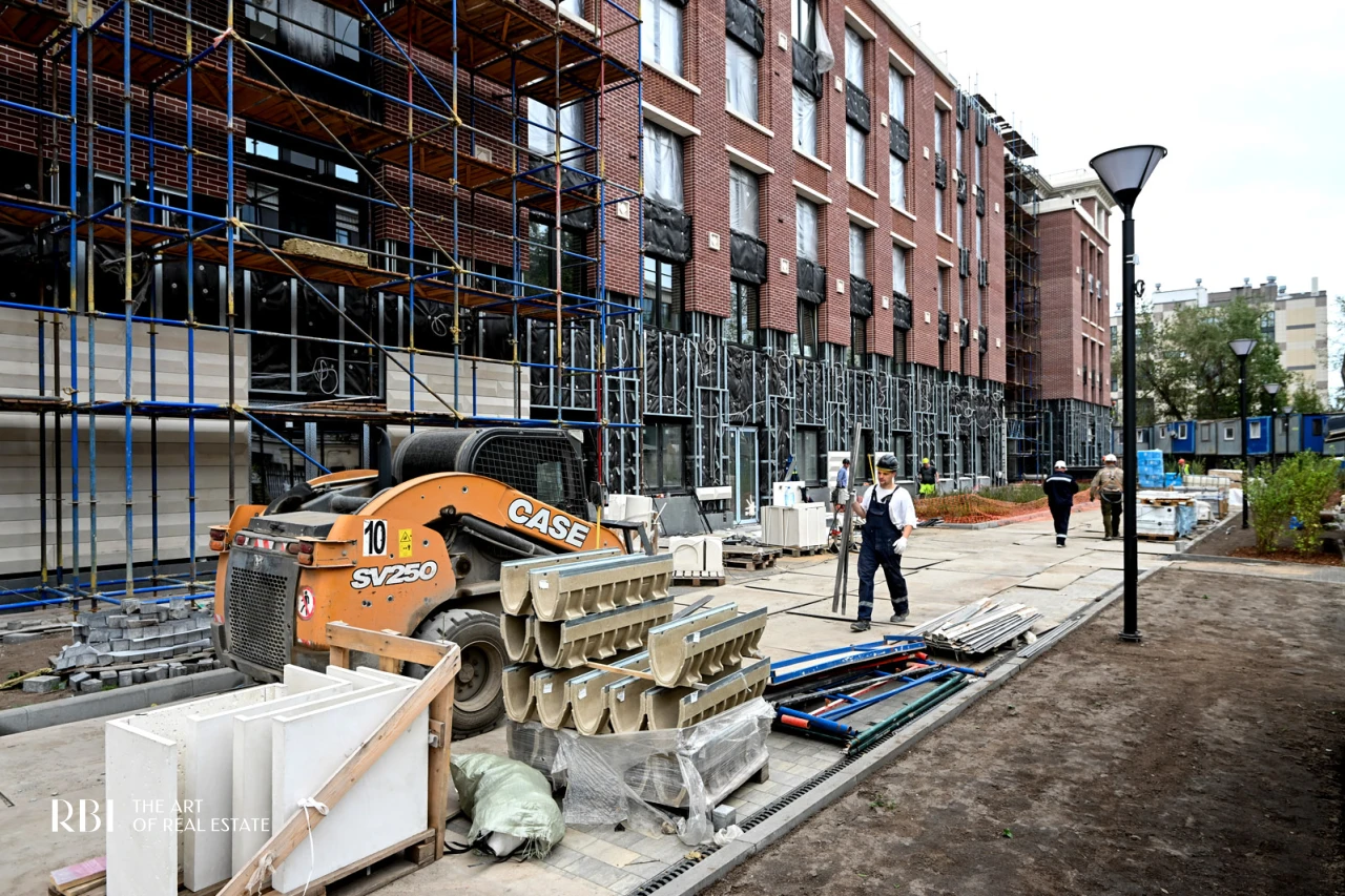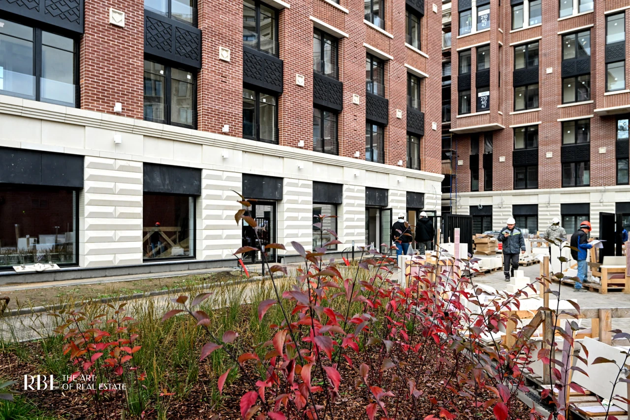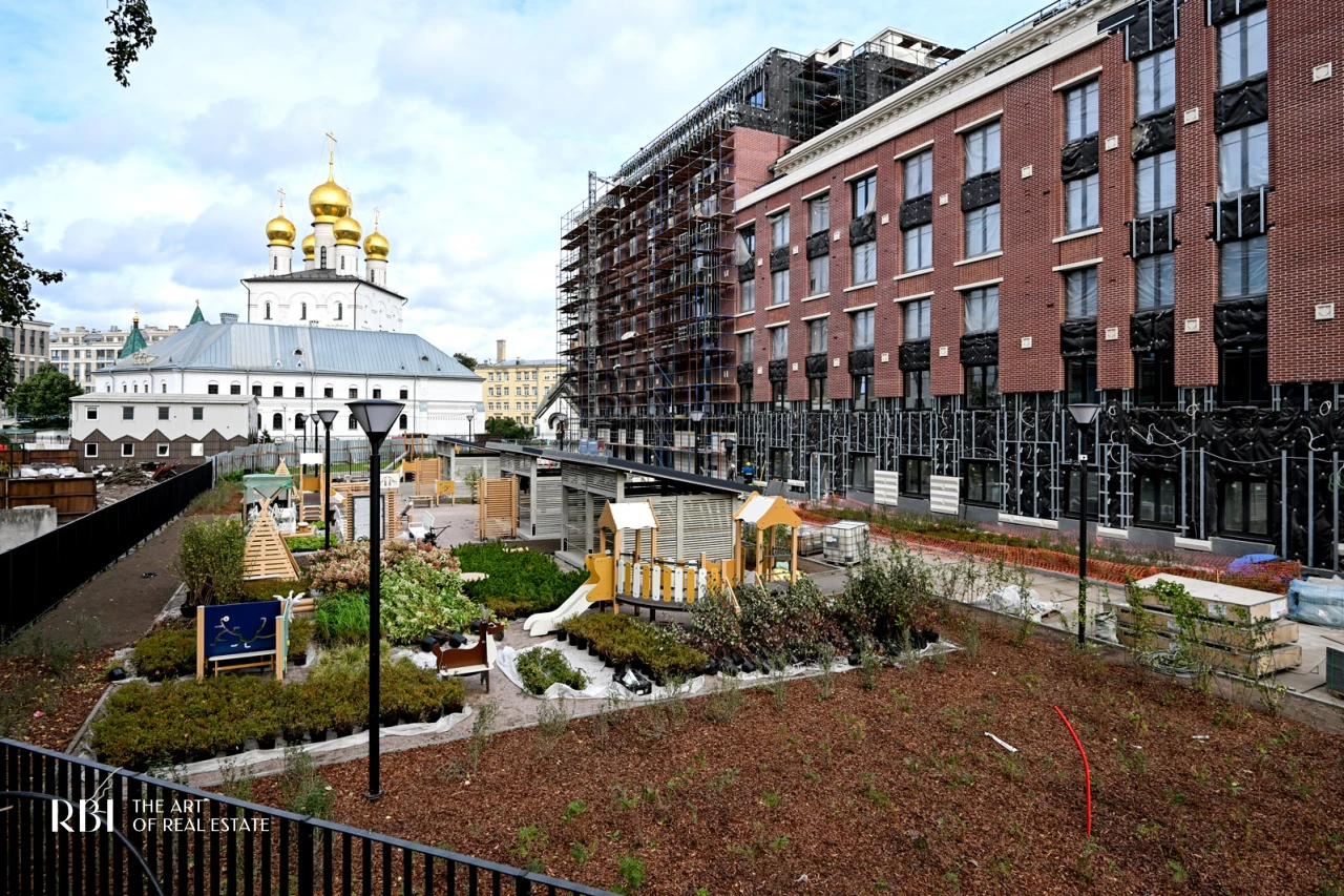 Большое значение RBI придает благоустройству придомовой территории. Внутренний двор похож на зеленый сквер с детской площадкой из натуральных материалов, амфитеатром, деревянными шезлонгами, уличными обогревателями и пространством под навесом.