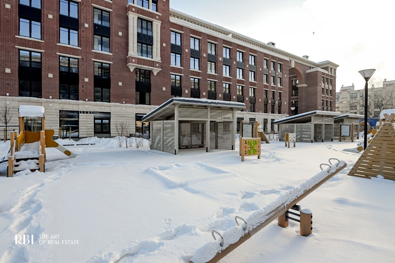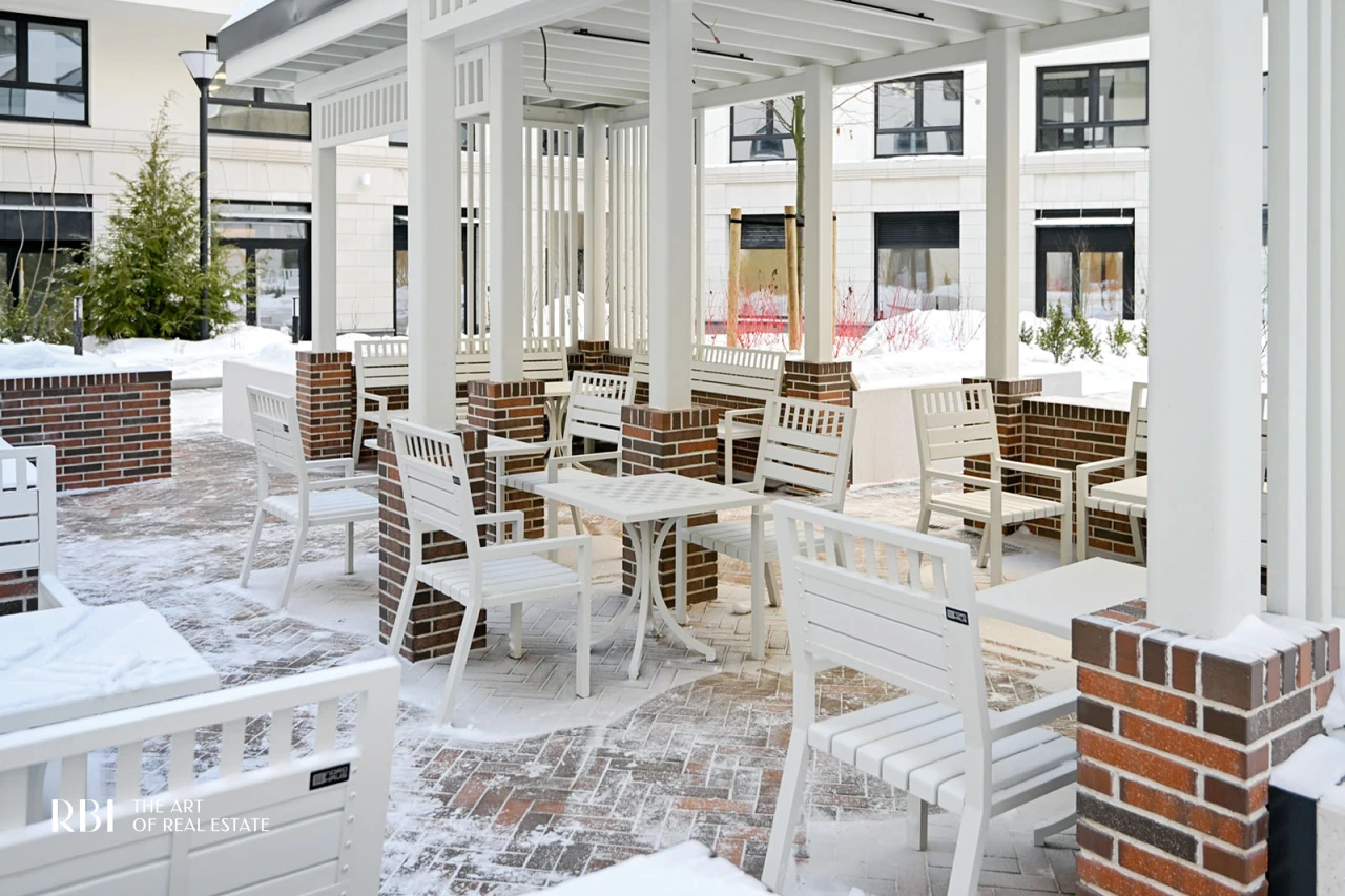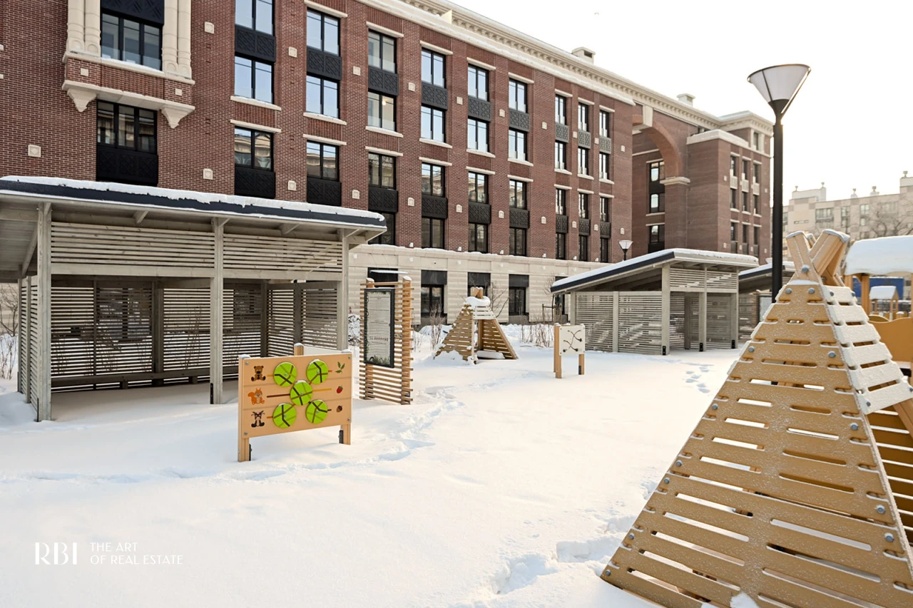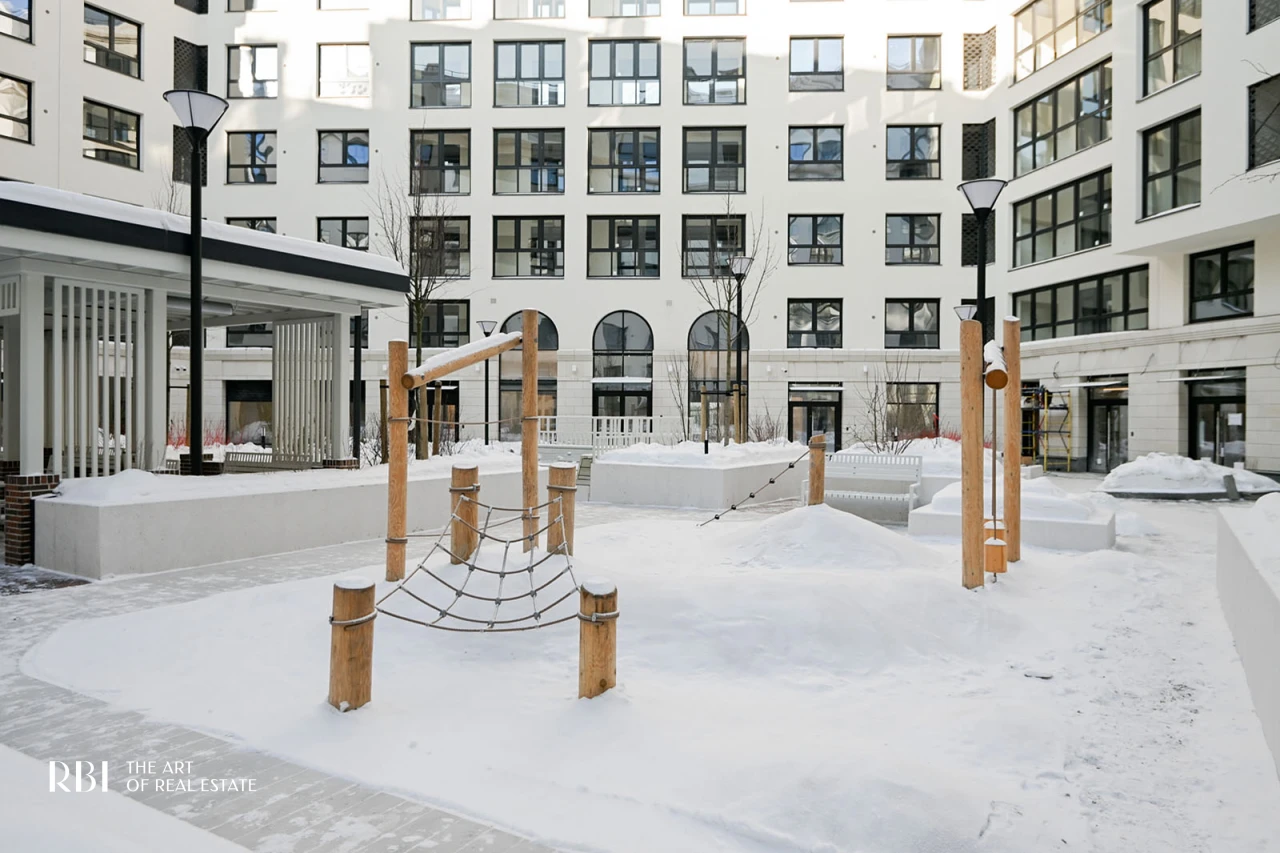 Большое значение RBI придает благоустройству придомовой территории. Внутренний двор похож на зеленый сквер с детской площадкой из натуральных материалов, амфитеатром, деревянными шезлонгами, уличными обогревателями и пространством под навесом.